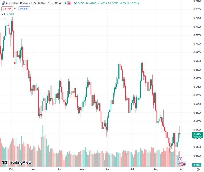 AUDUSD currently trading at 0.6475 at the time of writing. Pair opened at 0.648 and is trading with a change of -0.08 % .