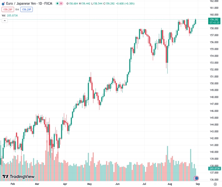 EURJPY currently trading at 159.31 at the time of writing. Pair opened at 158.72 and is trading with a change of 0.37 % .