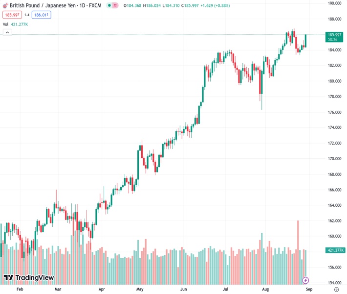 - GBP/JPY surges to 185.90, gaining more than 150 pips or 0.88%, as US economic data reduces the likelihood of Fed rate hikes.