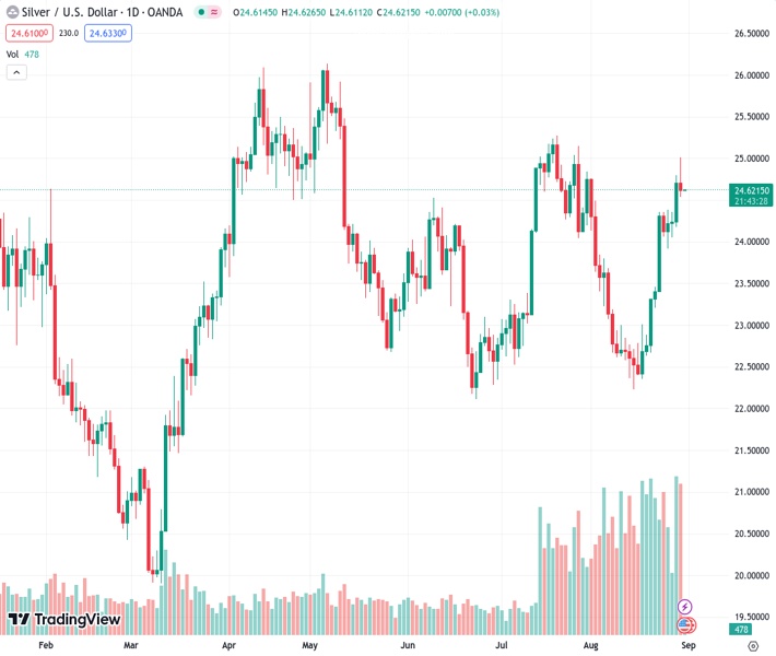 XAGUSD currently trading at 24.62 at the time of writing. Pair opened at 24.72 and is trading with a change of -0.40% % .
