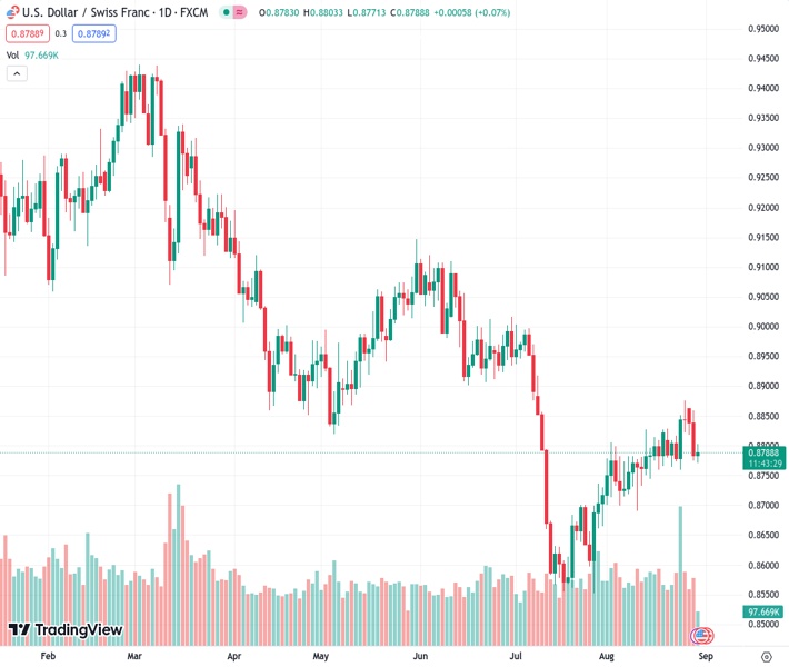 USDCHF currently trading at 0.8795 at the time of writing. Pair opened at 0.8784 and is trading with a change of 0.13 % .