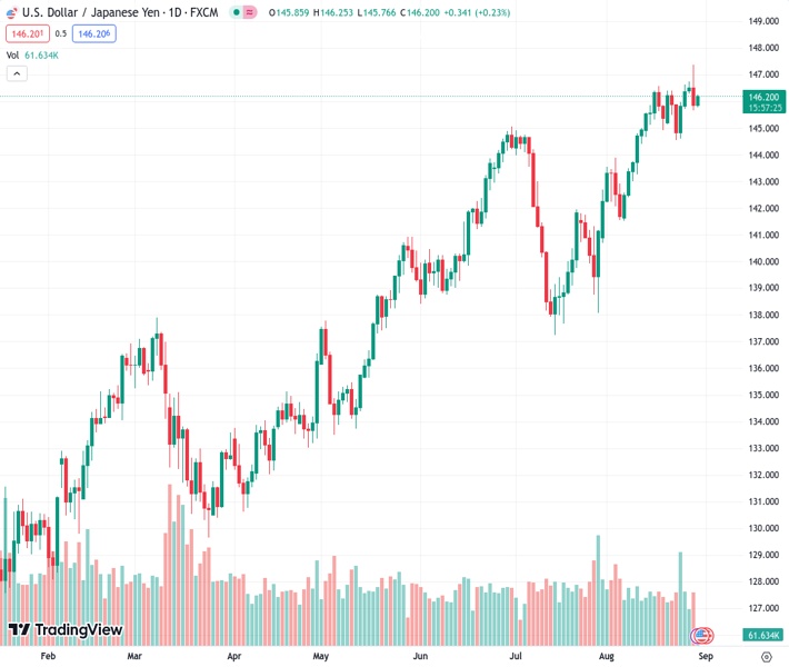 The USDJPY pair is currently trading at approximately 146.20, moving higher and recovering from its previous decline.