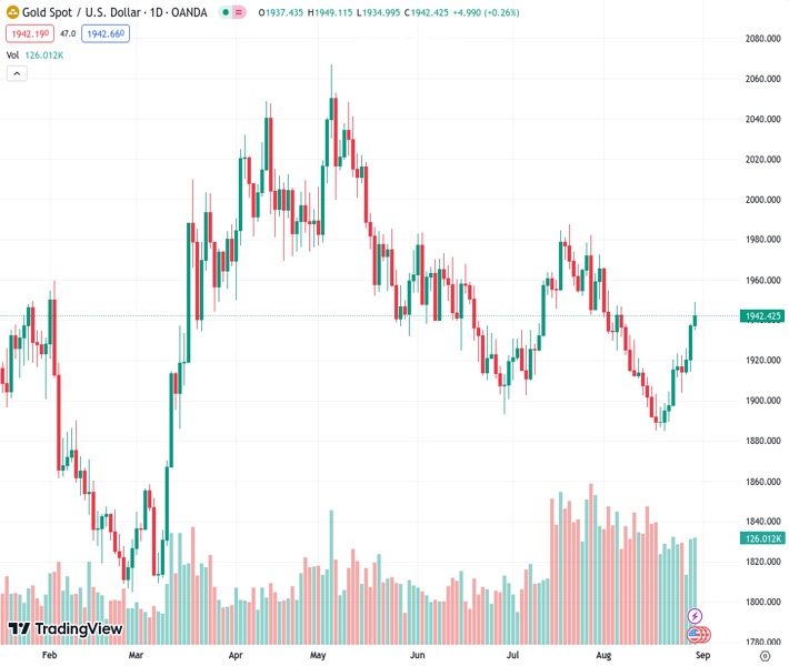 The XAUUSD pair, currently at 1,942.54, has achieved three consecutive days of gains and is trading close to the $1,940 level, with approximately 0.30% increase in daily value.