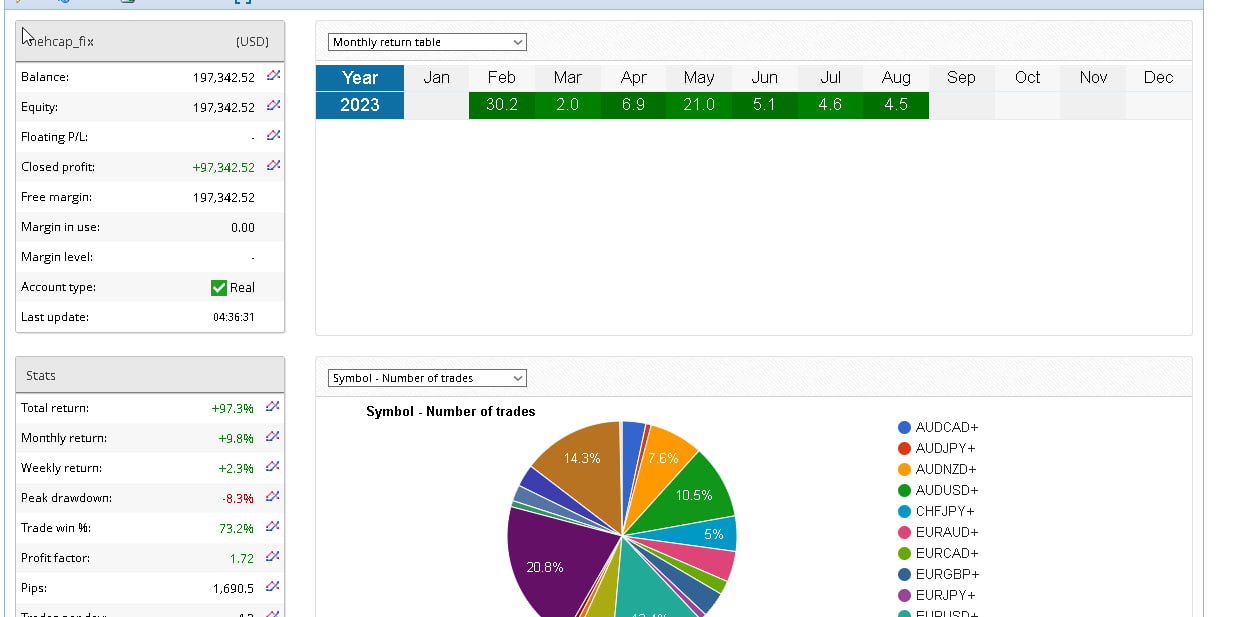 The August returns has risen to 4.3%. Overall returns now stand at +96.9%. The live account has risen from $100k to 196.9k.