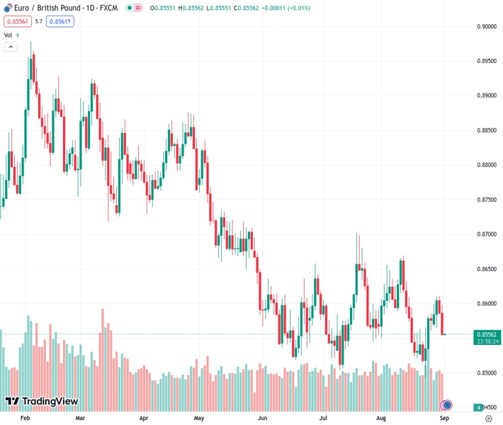 EURGBP currently trading at 0.8556 at the time of writing. Pair opened at 0.8587 and is trading with a change of -0.36 % .