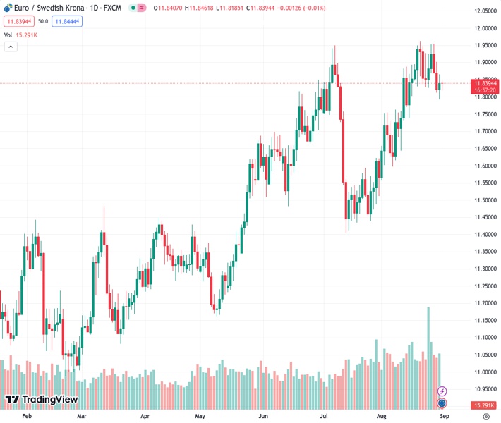 EURSEK currently trading at 11.8433 at the time of writing. Pair opened at 11.8436 and is trading with a change of -0.00% % .