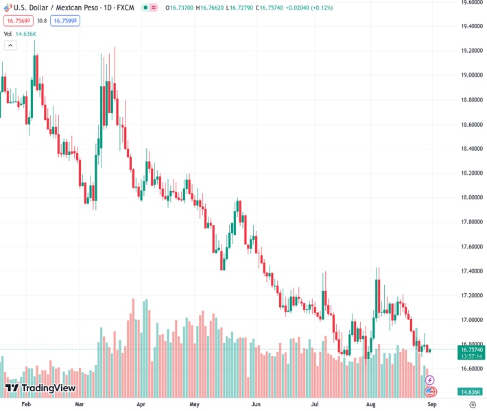 The exchange rate between the US Dollar and the Mexican Peso, currently at 16.7568, is stabilizing as it prepares for the upcoming release of economic data from the United States.