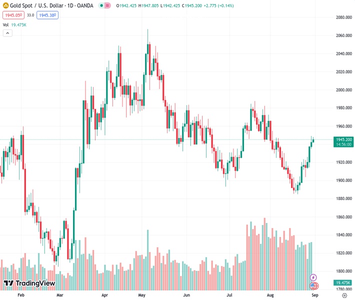 The price of gold at $1,945.61 per unit is still strong and at a high point for multiple days, but it hasn’t been able to maintain its momentum recently.