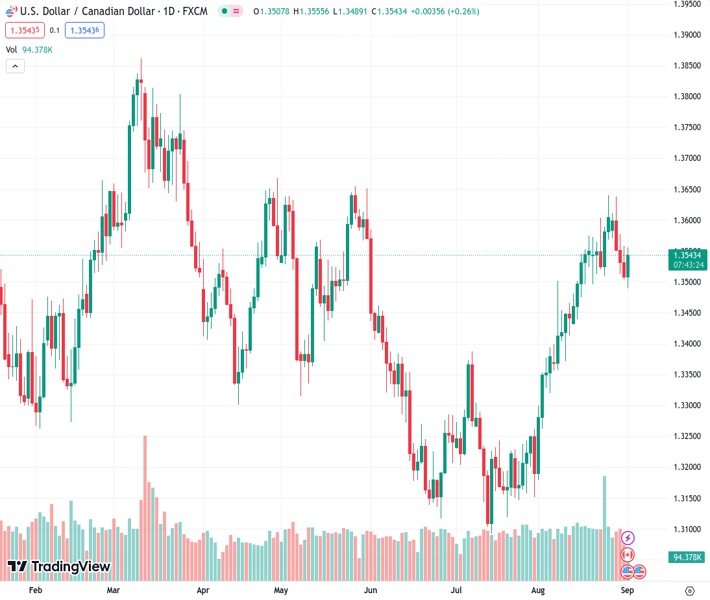 The Canadian economy unexpectedly declined in the second quarter, with the USDCAD exchange rate at 1.35491.
