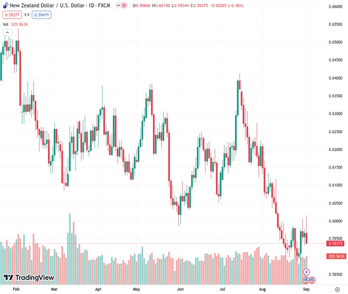 The currency pair NZDUSD, at a rate of 0.59372, reached its highest value of the day at 0.6015 before sharply decreasing to 0.5940.