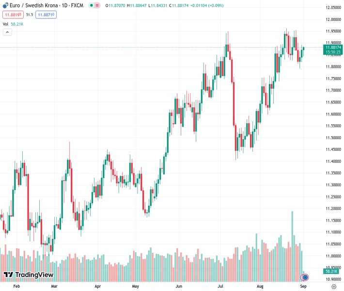 EURSEK currently trading at 11.8875 at the time of writing. Pair opened at 11.877 and is trading with a change of 0.09 % .