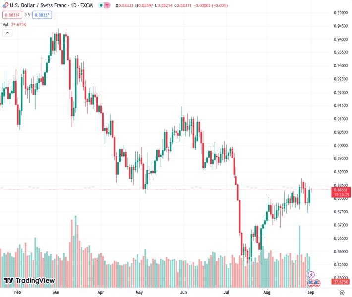 USDCHF currently trading at 0.8833 at the time of writing. Pair opened at 0.8834 and is trading with a change of -0.01% % .