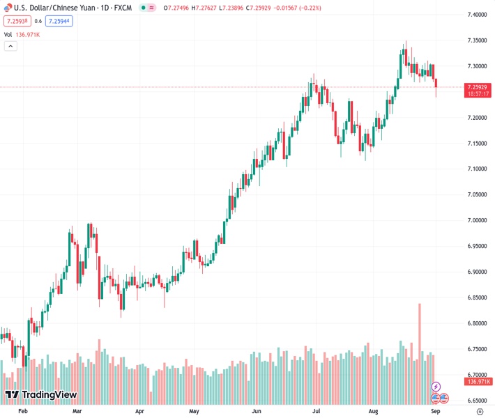 USDCNH currently trading at 7.2566 at the time of writing. Pair opened at 7.2746 and is trading with a change of -0.25% % .