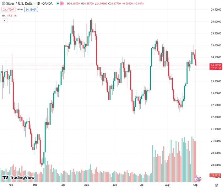 For the fourth day in a row, the price of silver, symbolized as XAGUSD at 24.164, has slightly declined and reached its lowest point in one week on Monday.