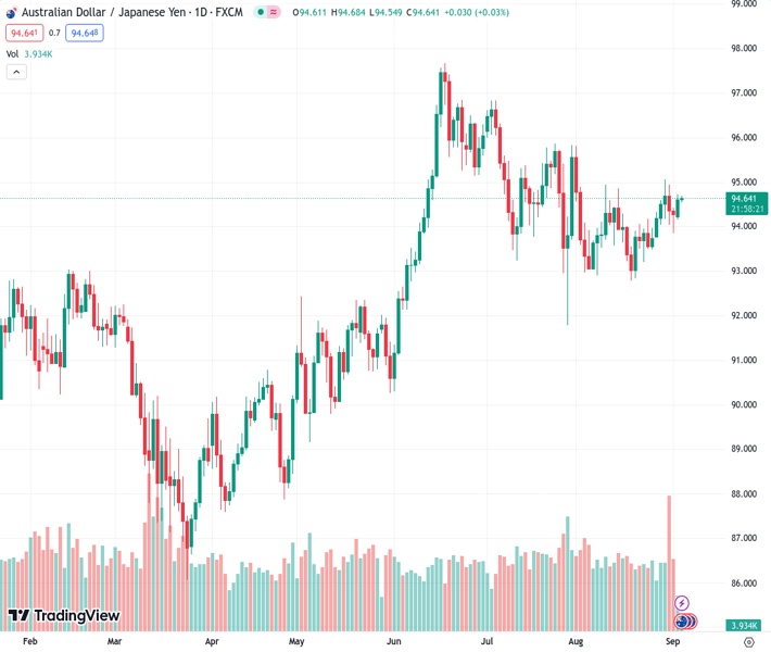 AUDJPY currently trading at 94.67 at the time of writing. Pair opened at 94.35 and is trading with a change of 0.34 % .
