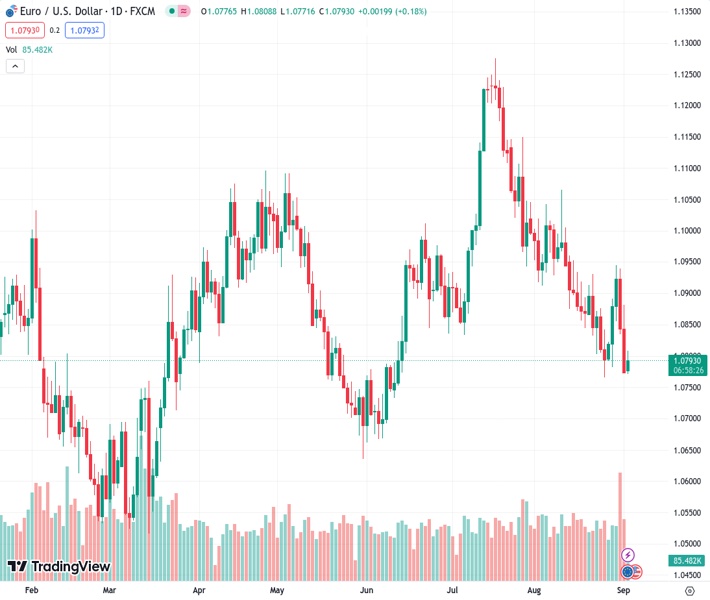The EUR/USD currency pair, which was trading at 1.07956, changes direction and moves back up to the 1.0800 range.