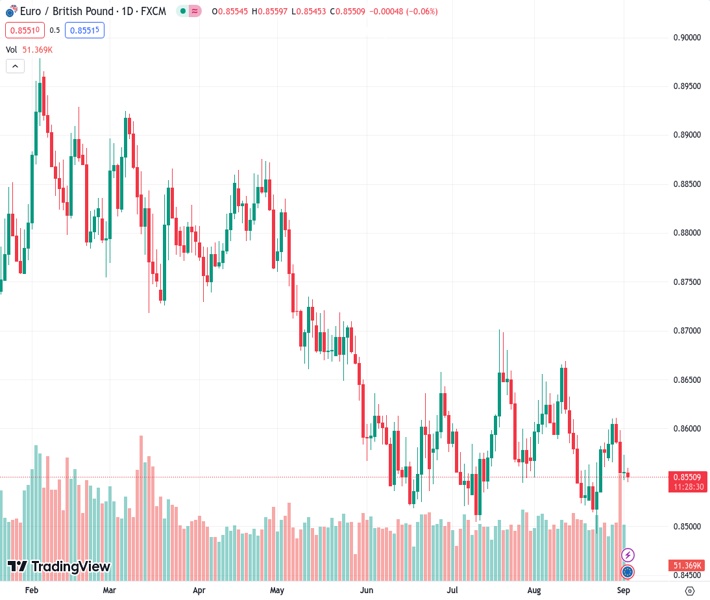 EURGBP currently trading at 0.8548 at the time of writing. Pair opened at 0.8559 and is trading with a change of -0.13 % .
