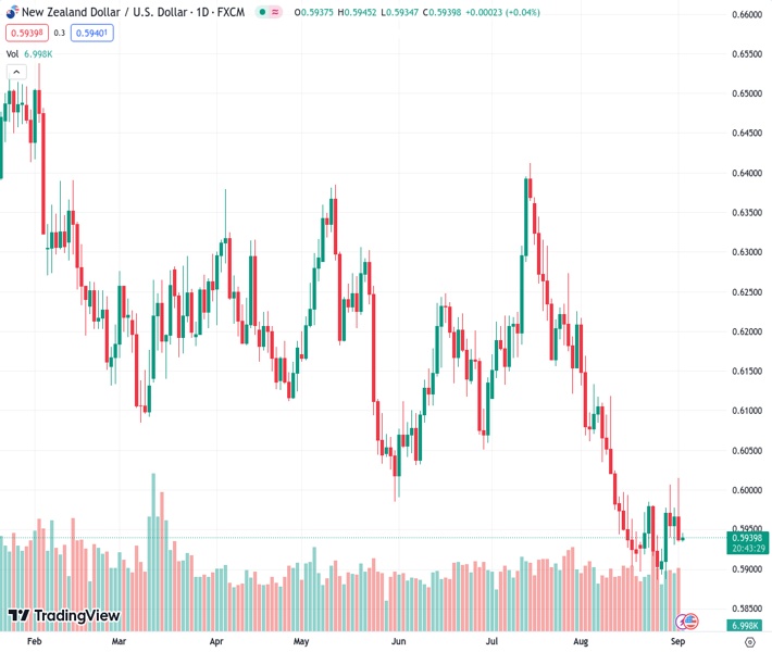 The NZDUSD pair is currently trading around 0.5956, lower from its previous level of 0.6015.