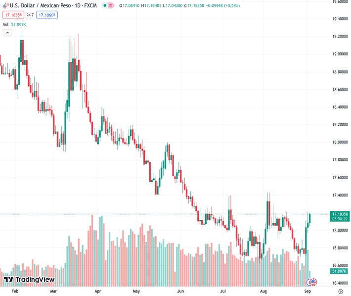 USDMXN currently trading at 17.1762 at the time of writing. Pair opened at 17.0944 and is trading with a change of 0.48 % .