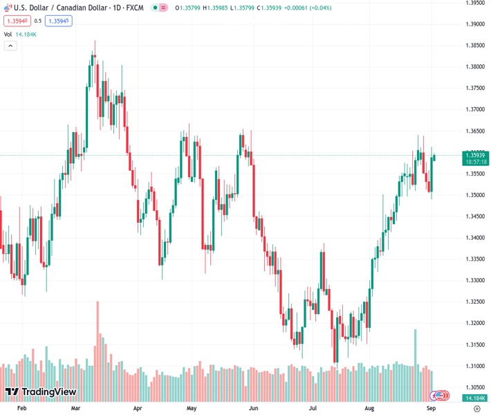 The USDCAD currency pair is experiencing an increase in value, trading at approximately 1.3590, following the release of data from both the United States and Canada last week.