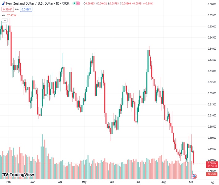 NZD/USD extends its losing streak for the third consecutive day, trading lower around 0.5890 during the Asian session on Tuesday. The pair is experiencing downward pressure due to China’s downbeat Caixin Services PMI for August, which declined to the reading of 51.8 from 54.1 prior. The report reinforces worries about deteriorating economic conditions in the world’s second-largest economy, which exerts downward pressure on the NZD/USD pair.