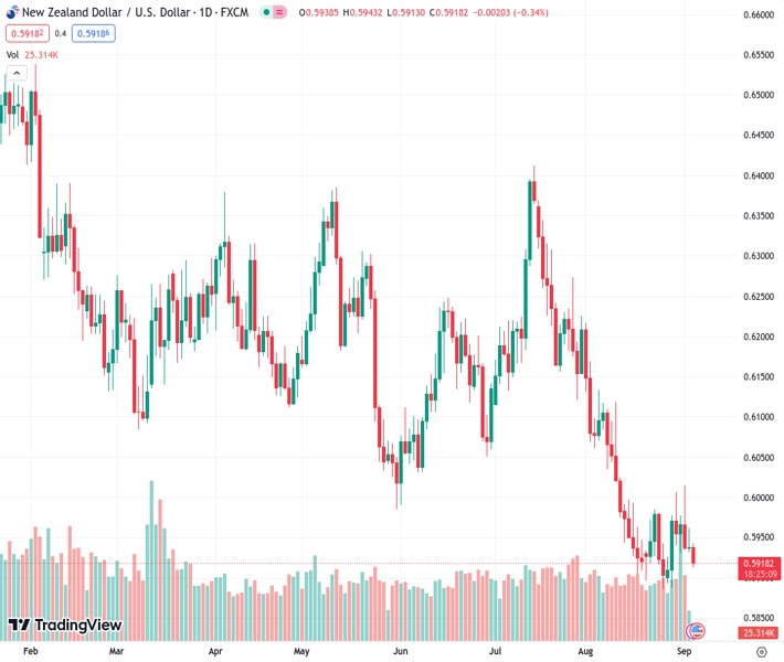 The NZDUSD, trading at 0.59164, slightly declines on Tuesday due to the underwhelming announcement of Chinese PMI.