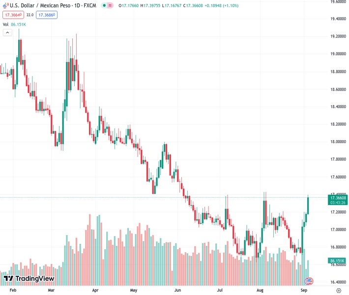 The US Dollar to Mexican Peso currency pair, with a value of 17.3572, increased by 0.88% and is now trading at 17.3270. This occurred as a result of the Bank of Mexico reducing its currency hedge program, which has led to increased instability in the currency pair.