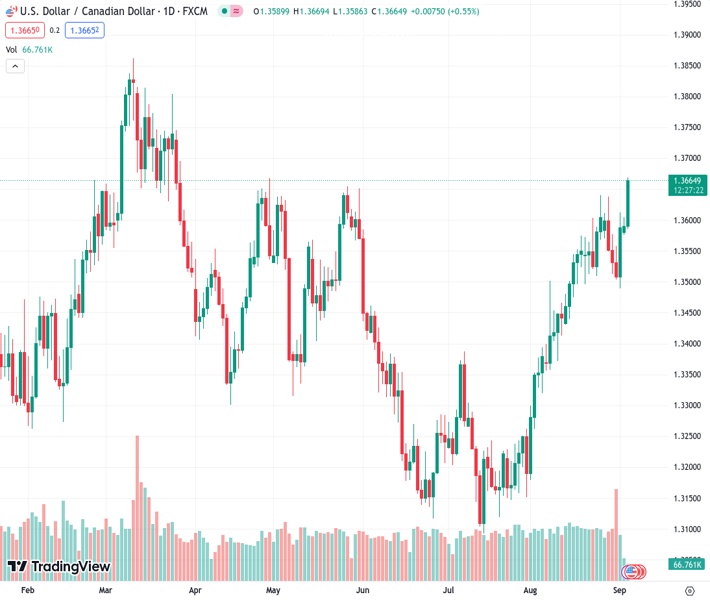 USDCAD currently trading at 1.3664 at the time of writing. Pair opened at 1.3591 and is trading with a change of 0.54 % .