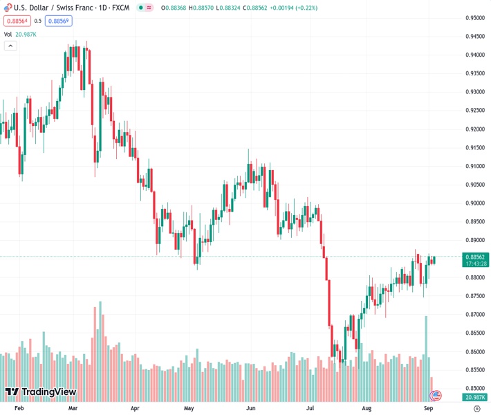 The USDCHF currency pair, at a rate of 0.88558, is experiencing increased demand, leading to a rise in the intraday high. This has resulted in a reversal of the decline seen the previous day from a one-week high.