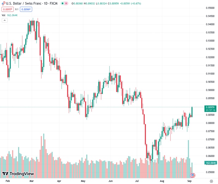 USDCHF currently trading at 0.8896 at the time of writing. Pair opened at 0.8844 and is trading with a change of 0.59 % .