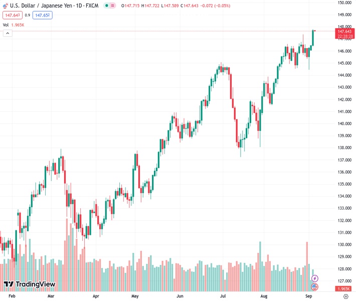The USDJPY currency pair, currently trading at 147.621, is fluctuating at its highest point in 2023 following a significant rise, which is also the largest increase in five weeks.
