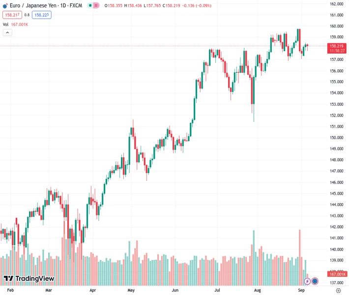 EURJPY currently trading at 158.25 at the time of writing. Pair opened at 158.4 and is trading with a change of -0.09 % .