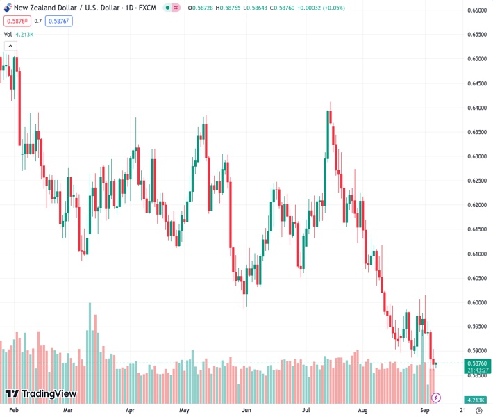 The NZD/USD pair remains under pressure and reaches the lowest level since November 2022 during the early Asian session on Thursday. The pair currently trades near 0.5872, down 0.01% on the day.