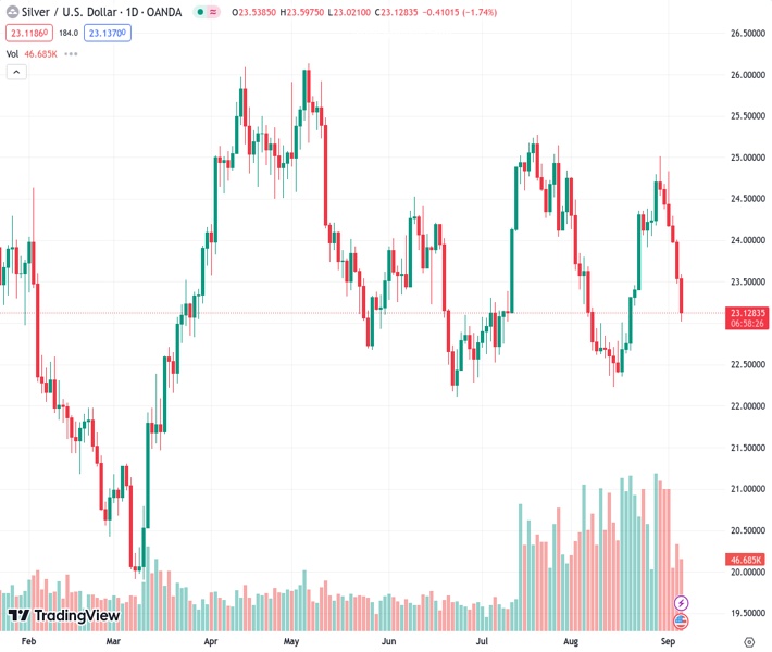 • Silver price corrects vertically to near the 200-day EMA, which trades around $23.30.