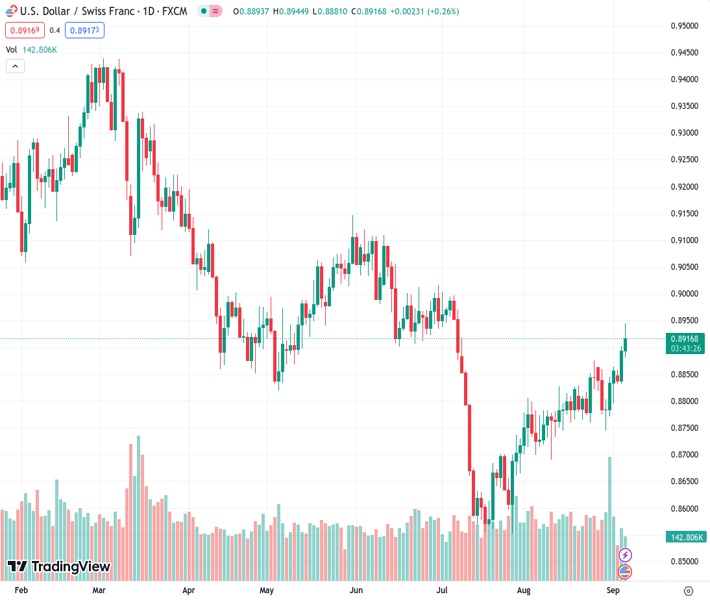The USD/CHF pair, currently trading at 0.89176, increased to its highest level in a month since July, approaching 0.8920.