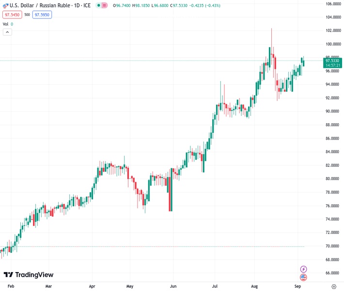 The USD/RUB currency pair, currently at 97.5625, experiences a slowdown in its progress around the 97.70 mark due to the surge in oil prices.