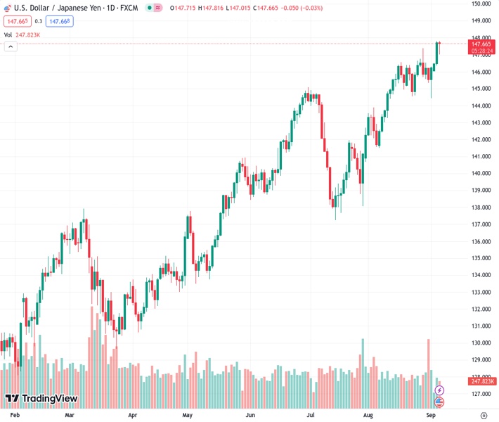 The USDJPY currency pair, which was at 147.643, increases its value following the release of the US ISM Non-Manufacturing PMI for August, which exceeded expectations by recording a reading of 54.5 instead of the anticipated 52.5.
