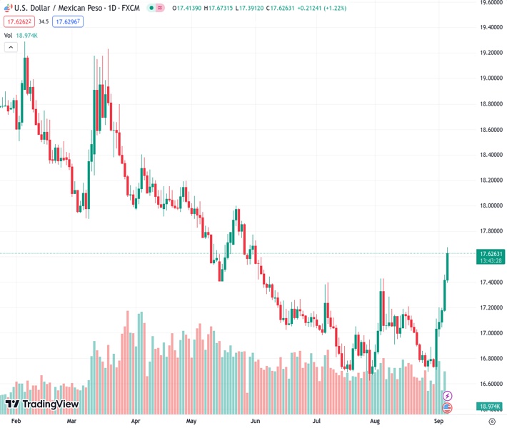 USDMXN currently trading at 17.4969 at the time of writing. Pair opened at 17.4171 and is trading with a change of 0.46 % .