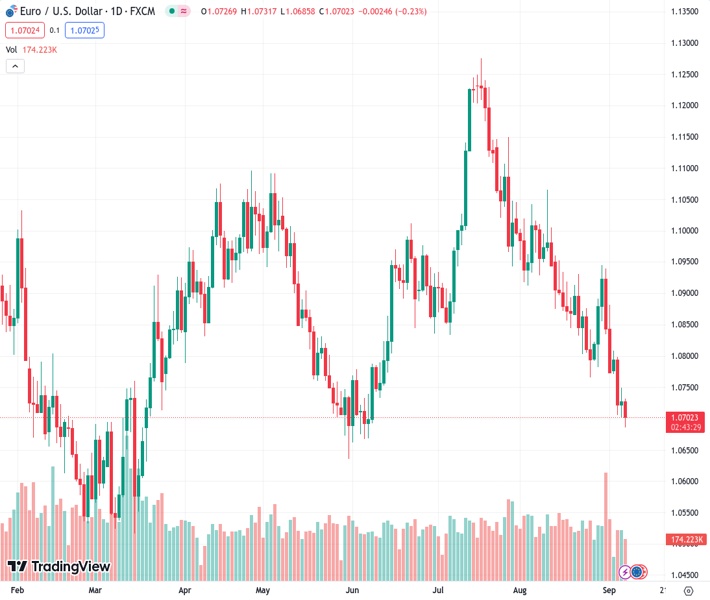 EURUSD currently trading at 1.0699 at the time of writing. Pair opened at 1.0727 and is trading with a change of -0.26 % .