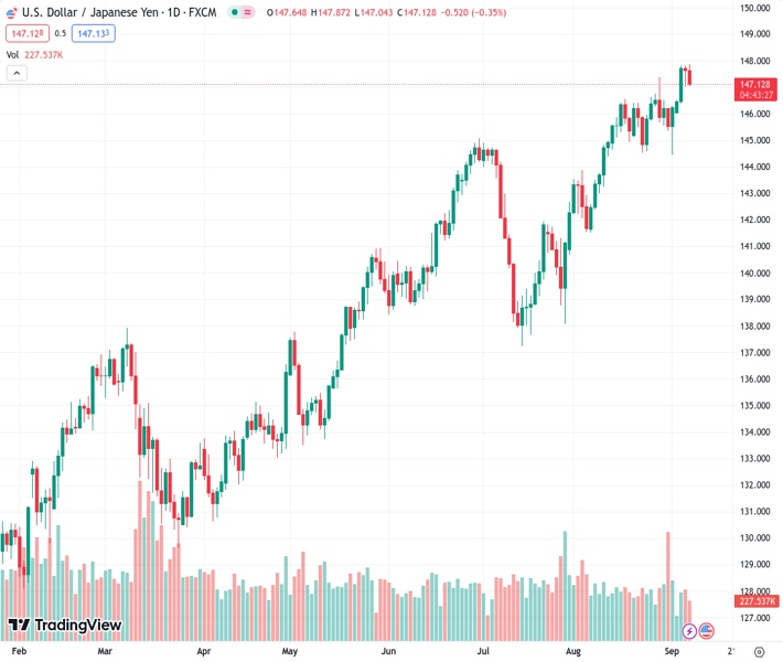 USDJPY currently trading at 147.18 at the time of writing. Pair opened at 147.66 and is trading with a change of -0.33 % .