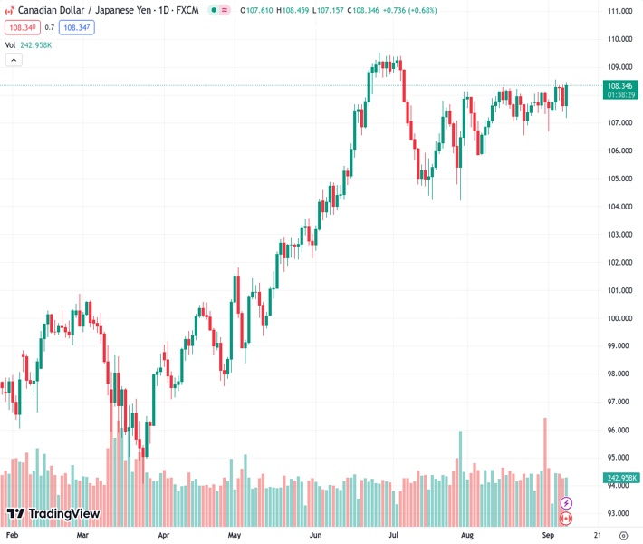 The CADJPY pair, currently trading at 108.3500, has increased by 0.72% to reach 108.38. This rise in value is a result of the Canadian jobs report surpassing predictions, with the addition of 15K jobs and a decrease in the unemployment rate to 5.5%.
