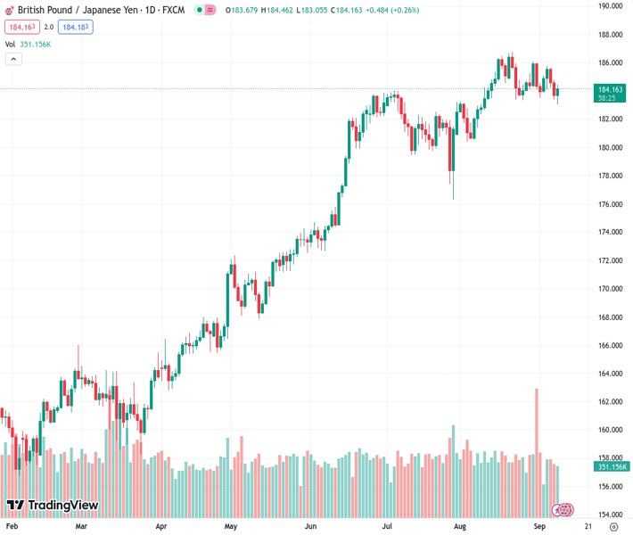 The GBPJPY currency pair is currently hovering around 184.134 as worries about the global economy hinder its upward momentum.