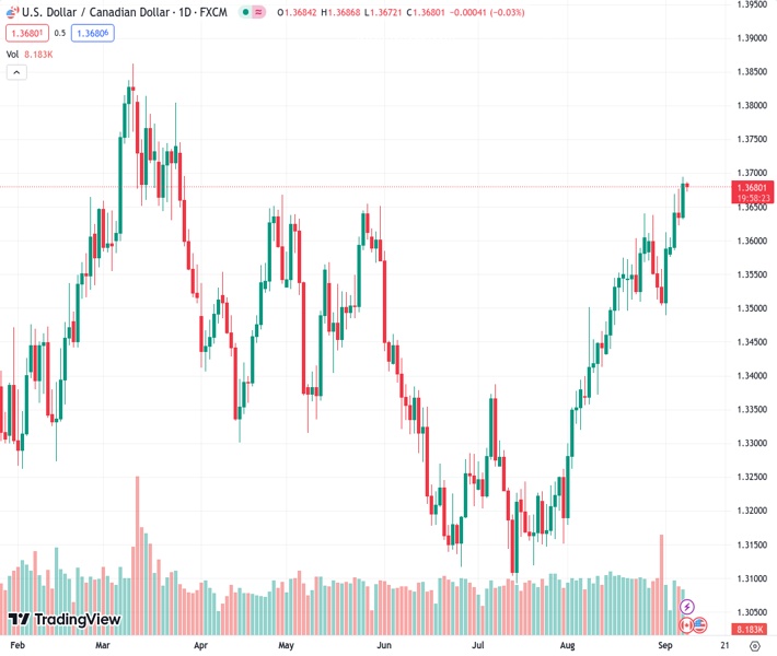 The USDCAD pair hovers around the range of 1.3678-1.3686, fluctuating within a tight trading range.