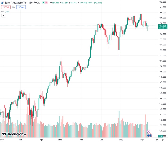 EURJPY currently trading at 157.52 at the time of writing. Pair opened at 158.23 and is trading with a change of -0.45 % .
