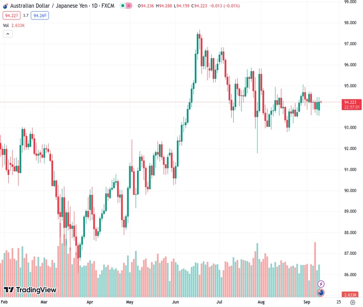 The exchange rate for the AUDJPY currency pair is currently at 94.22, showing little to no change as trading begins on Tuesday.