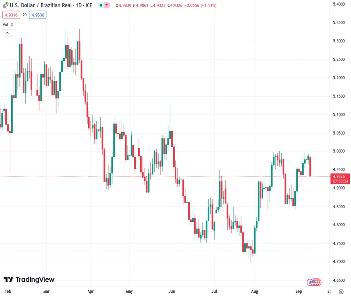 The US dollar to Brazilian real exchange rate of 4.93730 is expected to reach 5.05 by the end of the year, according to Rabobank.