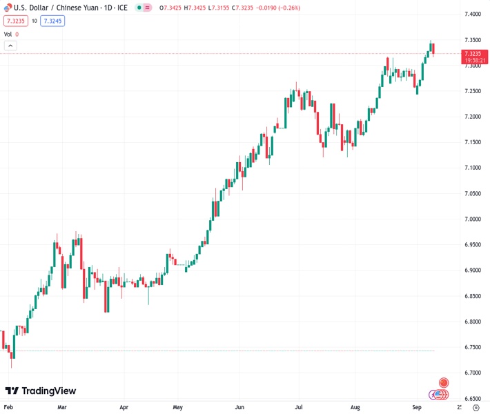 The USD to CNY exchange rate is currently at 7.34318, while the People’s Bank of China (PBOC) has set the reference rate at 7.2148, slightly lower than the previous rate of 7.2150.