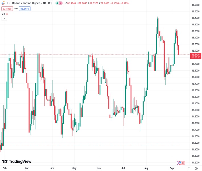 USDINR currently trading at 82.8474 at the time of writing. Pair opened at 83.046 and is trading with a change of -0.24 % .