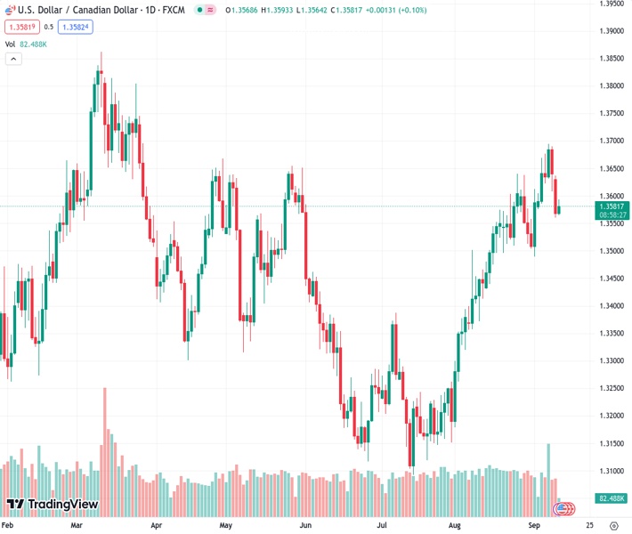 Scotiabank believes that there is a higher probability for the USDCAD pair to move downwards, based on the current exchange rate of 1.35815.
