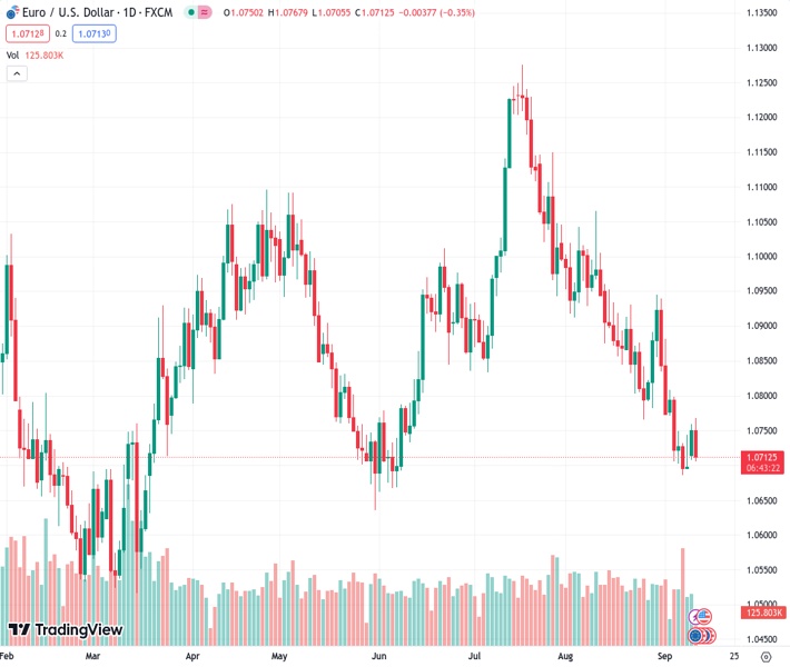 Societe Generale suggests that the EUR/USD exchange rate, currently at 1.07128, could potentially decline further towards 1.05.